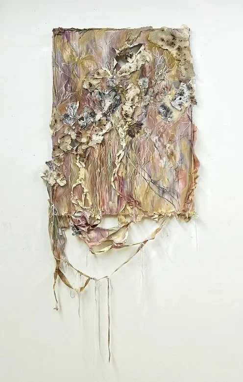In her 2D work, Vaccaro incorporates similar aesthetic motifs. Her paintings display thin, fibrous lines; richly-layered compositions; and floral tones that recall the dried flowers and ecological elements found in her sculptures. And like her mixed media works, Vaccaro’s prints embody fluid configurations that direct viewers around the surface – recreating the experience of navigating the complex topography that is one’s personal history. With many of her sculptures, paintings, and prints created during a similar period, Vaccaro’s works include much of the same gestures and interests, while reimagining certain techniques.