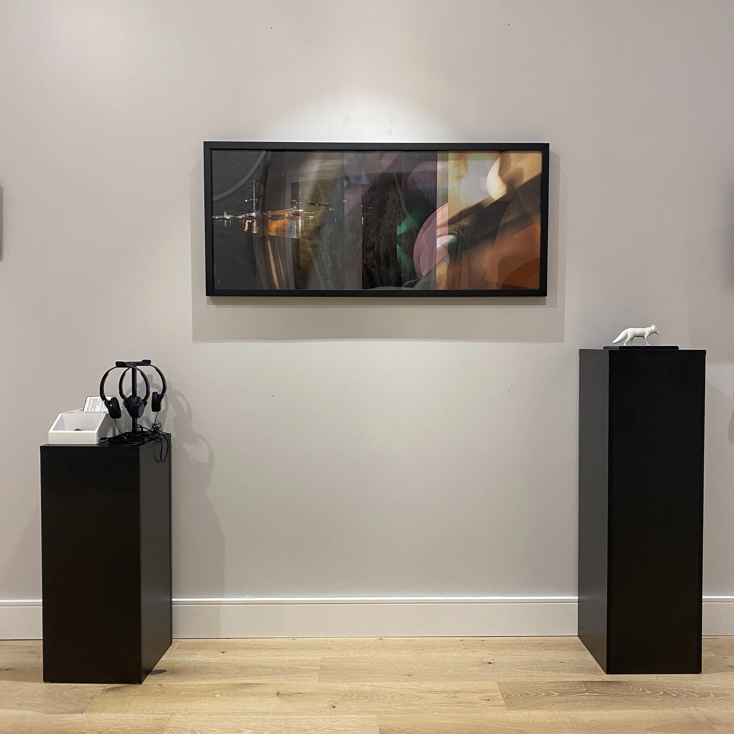 Moving into photography, video, and sound, Allida Warn, Alysia Macaulay, Meredith Starr, Dayna Leavitt, and Corey Brown create scenes physical and digital, real and reworked. Warn explores the city of Jamaica Plain, MA through aluminum prints depicting an “an animated process drawing of seasonal change” while Macaulay reflects on her time in Ocala, FL – creating the mirrored mixed-media photographic collage Two Live Oaks – Mondrian Style.